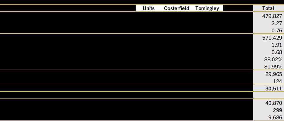 Alkane processed 571,429 tonnes of ore in total at an average gold grade of 2.27g/t Au producing 29,965 ounces of gold. Tomingley processed 314,970 tonnes of ore with an average gold grade of 2.15g/t. At Costerfield, the average grade of gold was 8.48g/t and the average grade of antimony was 0.68% over 22,671 tonnes of ore processed over two months while Björkdal processed 233,789 tonnes of ore with an average gold grade of 0.94g/t, also only over two months.