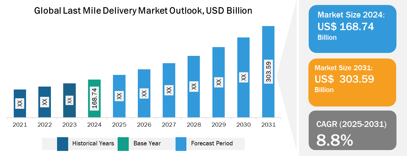 The Last Mile Delivery Market is projected to grow from US$ 168.74 billion in 2024 to US$ 303.59 billion by 2031, registering a compound annual growth rate (CAGR) of 8.8% between 2025 and 2031.