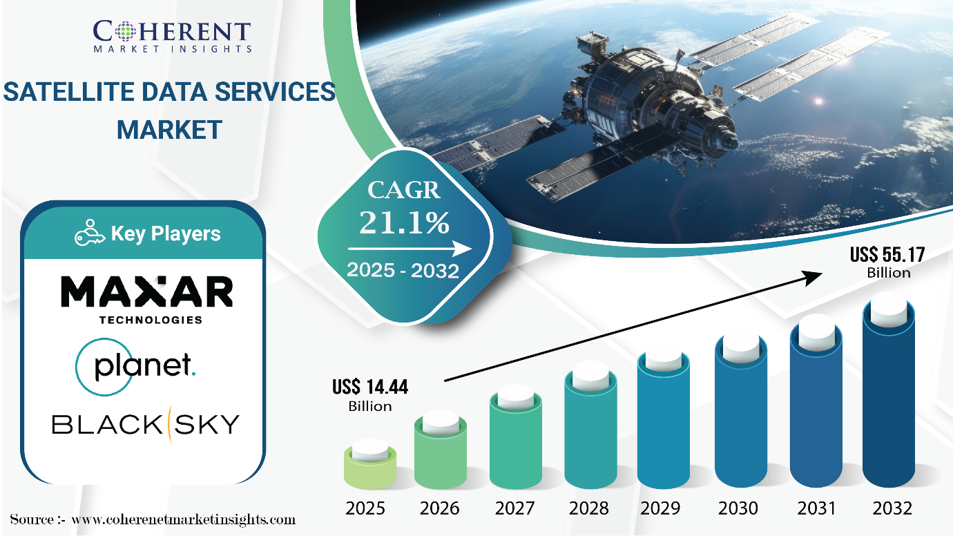 Burlingame, CA, May 11, 2025 (GLOBE NEWSWIRE) — Coherent Market Insights published a report, titled, the global satellite data services market size is estimated to grow from USD 14.44 Billion in 2025 and is forecast to reach a value of USD 55.17 Billion by 2032 at a CAGR of 21.1% between 2025 and 2032. Satellite data services involve the collection and analysis of Earth observation data acquired by artificial satellites orbiting the planet. These services provide critical insights into surface conditions, environmental changes, and weather patterns.