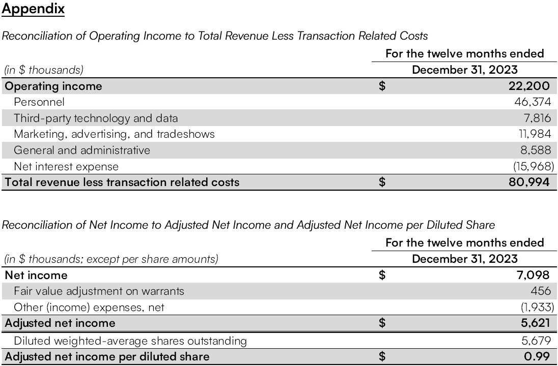- Total revenue less transaction-related costs is not intended to be measures of operating profit or cash flow profitability as they exclude key operating expenses such as personnel, general and administrative, and third-party technology and data, which have been, and will continue to be for the foreseeable future, significant recurring GAAP expenses.