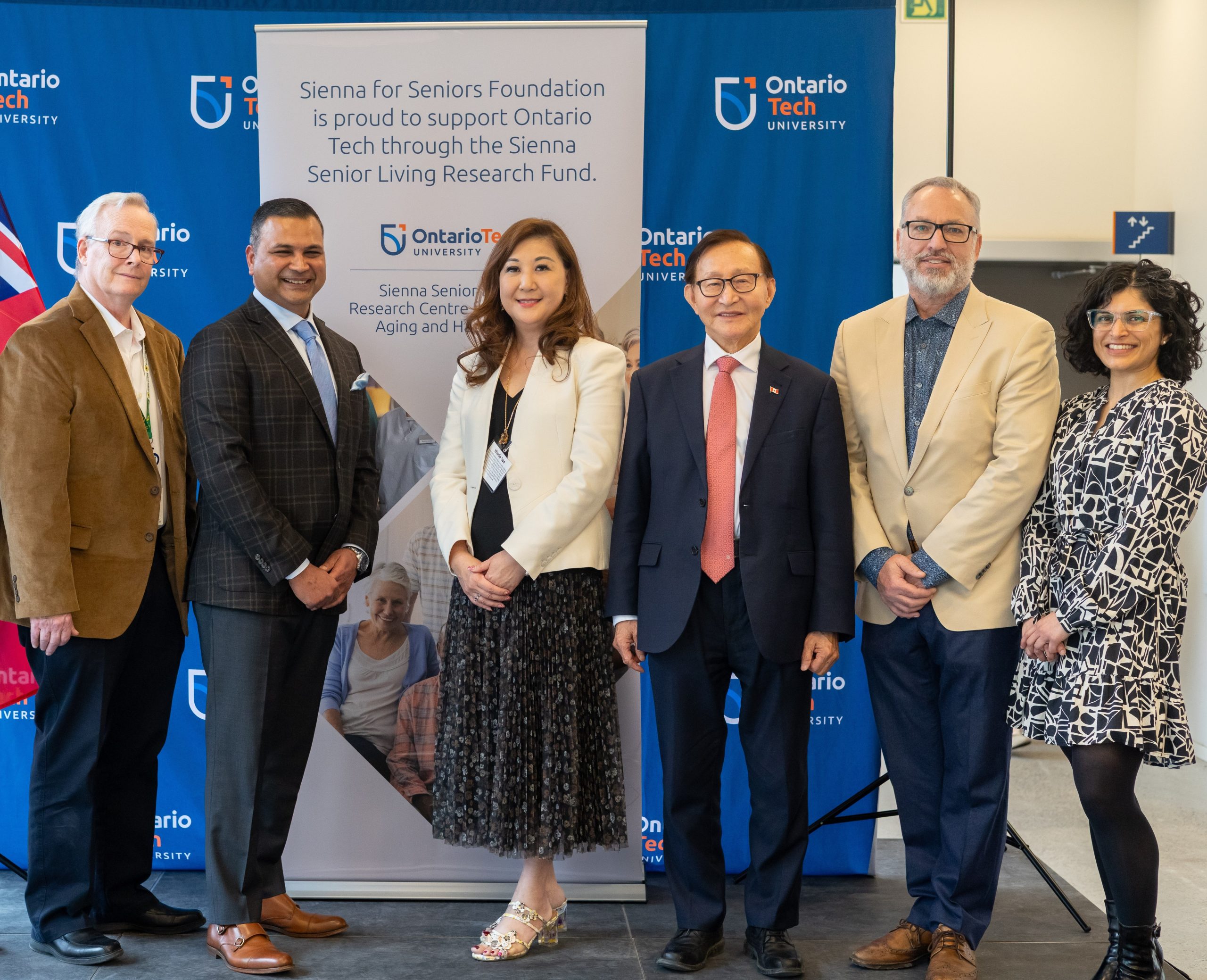 Pictured (left to right): John Henry, Regional Chair, Durham Region; Nitin Jain, President and CEO, Sienna Senior Living; Winnie Sun, Scientific Director of Wellness and Innovations in NeuroAging, Ontario Tech University; Hon. Raymond Cho, Minister for Seniors and Accessibility; Steven Murphy, President and Vice-Chancellor, Ontario Tech University; and Shilpa Dogra, Scientific Director of Active InnovAging at the Centre, Ontario Tech University.