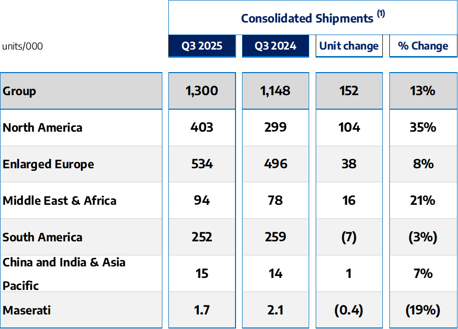 • North America posted a particularly strong rebound in Q3, with shipments growing by approximately 104 thousand units compared to the same period in 2024, a 35% y-o-y increase, including the initial deliveries of HEMI® V8-powered Ram 1500. This significant improvement primarily reflects the benefits of normalized inventory dynamics, in comparison to the prior year’s inventory reduction initiative, which temporarily reduced production.