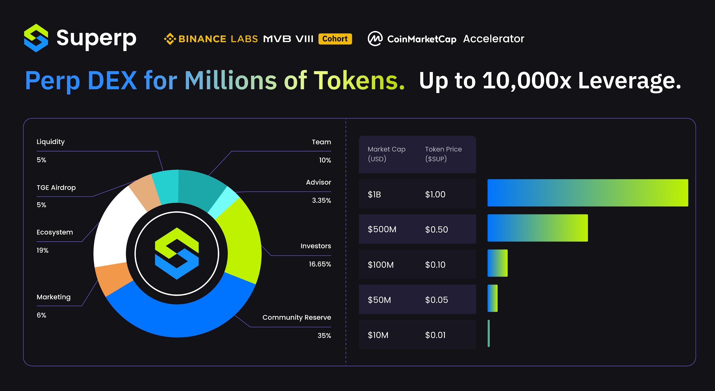 Built to power perpetual trading at scale, Superp allows traders to access millions of tokens with leverage up to 10,000x. Backed by Binance MVB Season 8 and CoinMarketCap accelerator. The protocol has already recorded more than $38 billion in cumulative trading volume and is backed by a strong group of institutional investors including UOB Ventures, ABCDE Labs, Paper Ventures, and The Brooker Group, among others.