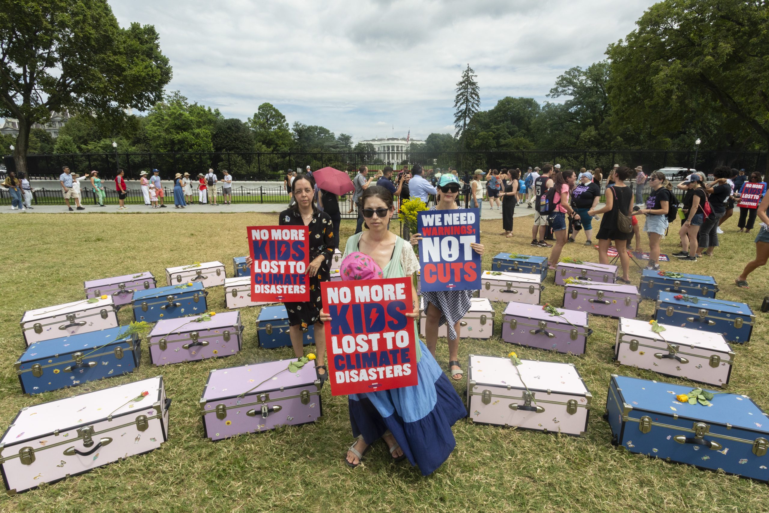 Organized by impacted families and the Make Polluters Pay, a campaign by Fossil Free Media, the memorial featured a powerful visual display of 27 children’s camp trunks on the Ellipse Lawn—each representing a young life lost. Parents placed yellow roses atop the trunks in silence before delivering impassioned remarks demanding federal accountability and urgent action to protect children from worsening climate-driven disasters.