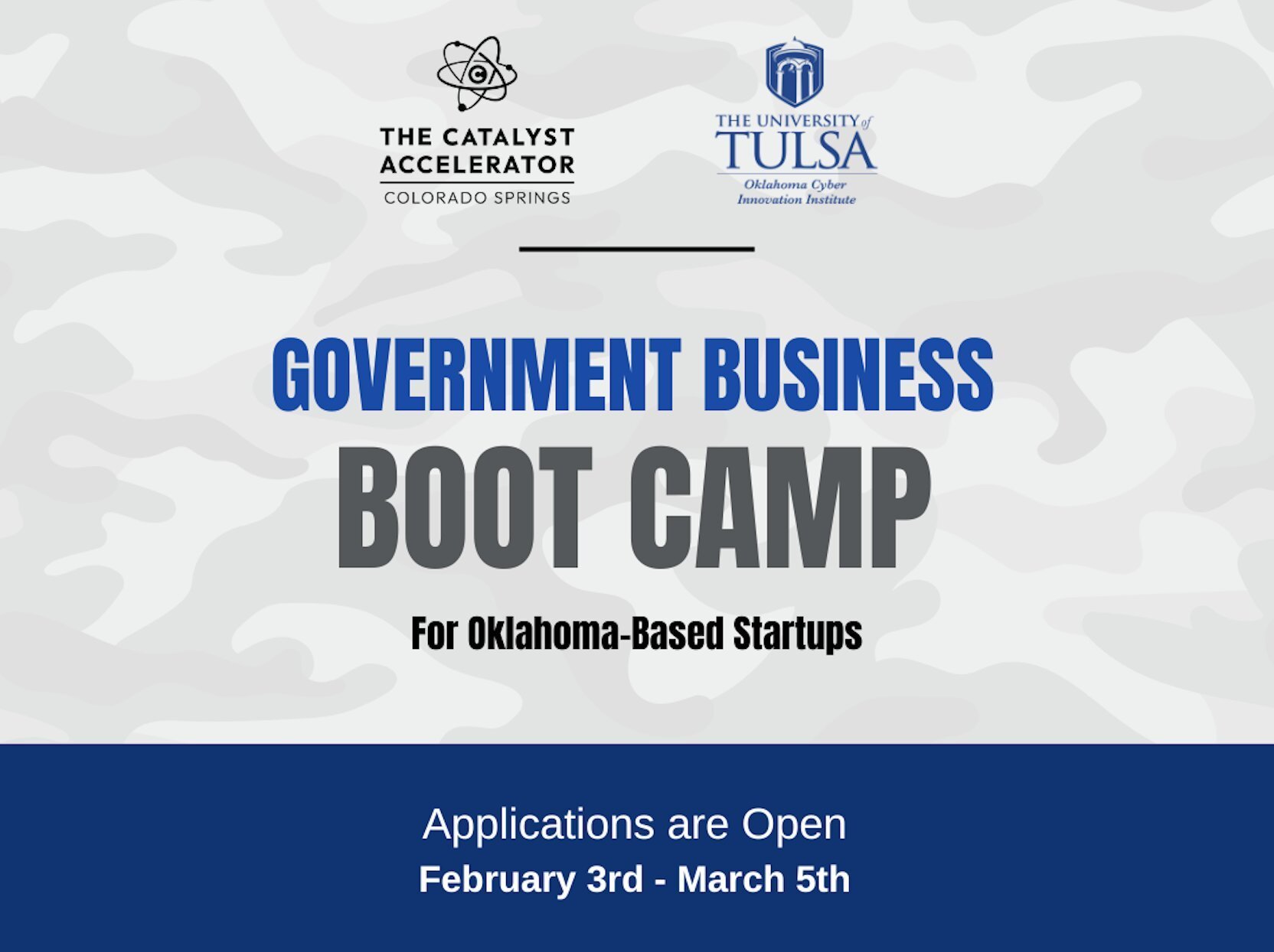 This Boot Camp is designed to help underserved small businesses in Oklahoma understand the pathway to doing business with various departments of the United States government. OCII and the Catalyst Accelerator are seeking startups with innovative dual-use technologies that offer commercial capabilities to support the U.S. government.