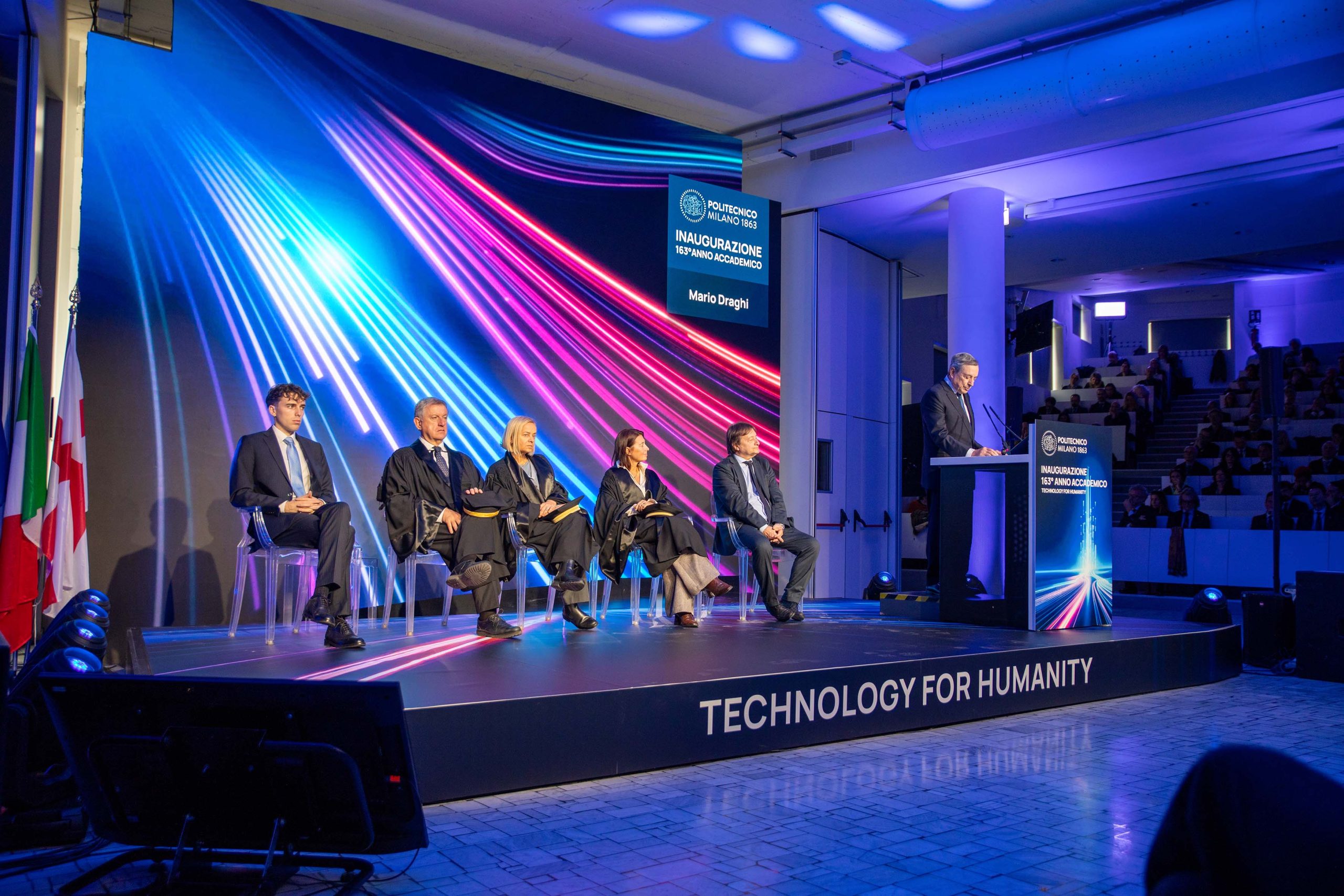 The speakers were: Mayor of Milan Giuseppe Sala, Lombardy Region’s Councillor for University, Research and Innovation Alessandro Fermi, President of the Student Council Michele Gaetano Giussani, Rector of the Politecnico di Milano Donatella Sciuto, President Mario Draghi.