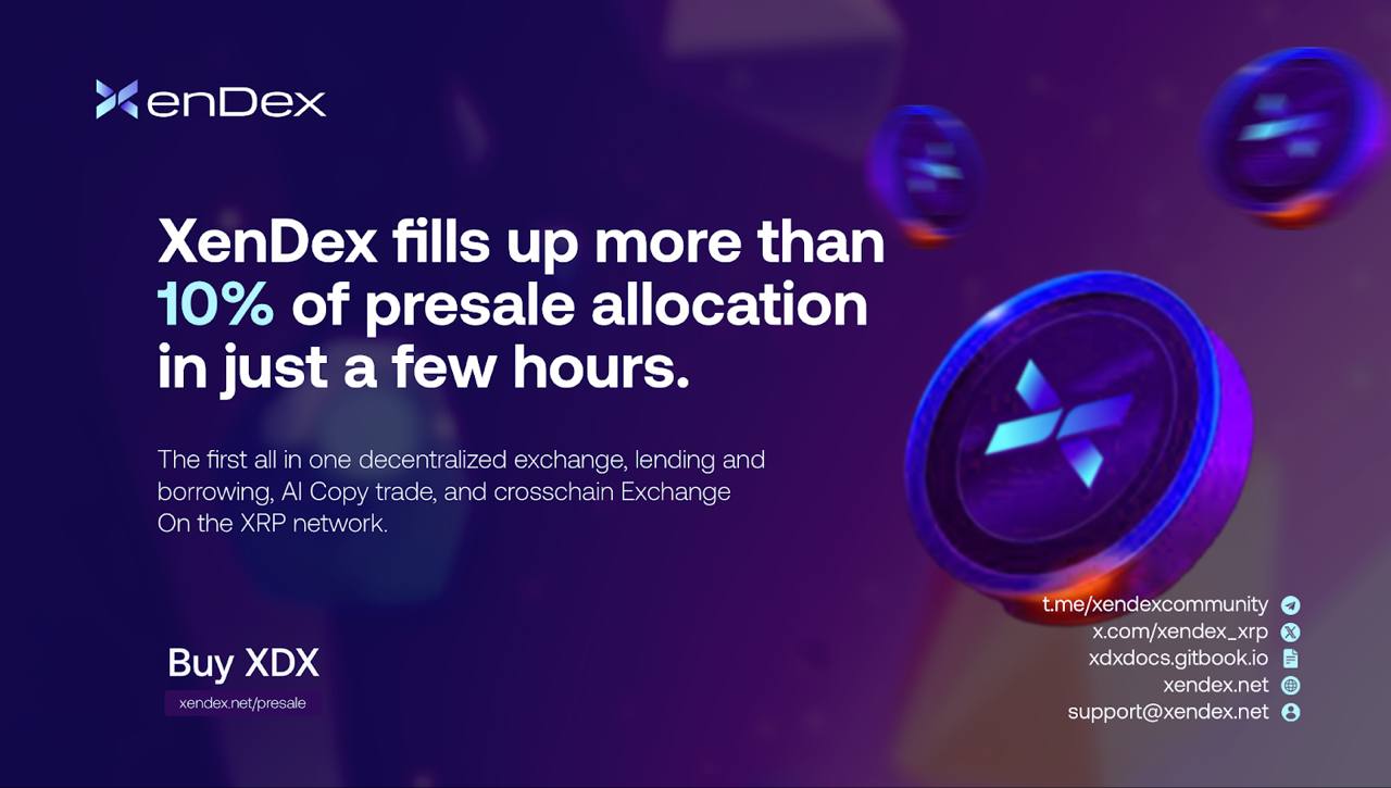 Within just six hours of presale launch, the XenDex presale has filled over 10% of its soft cap, signaling early momentum and notable participation from high-net-worth crypto investors. Whale activity continues to push the presale toward its next milestone as XRP holders position themselves for what many now see as the DeFi breakout project of the Ripple ecosystem.